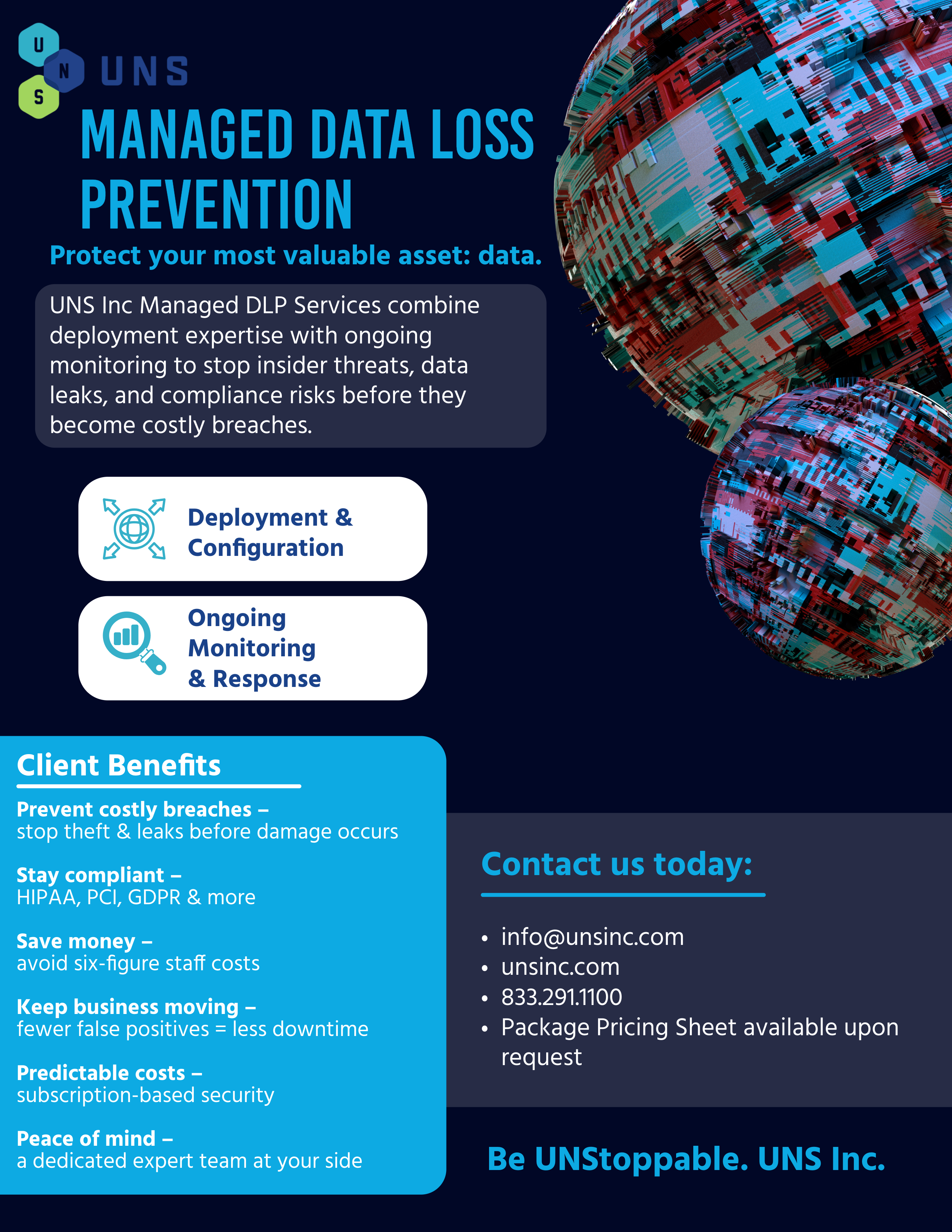 UNS Inc delivers a fully managed Data Loss Prevention program designed to stop data leaks, insider threats, and compliance risks before they disrupt your business.